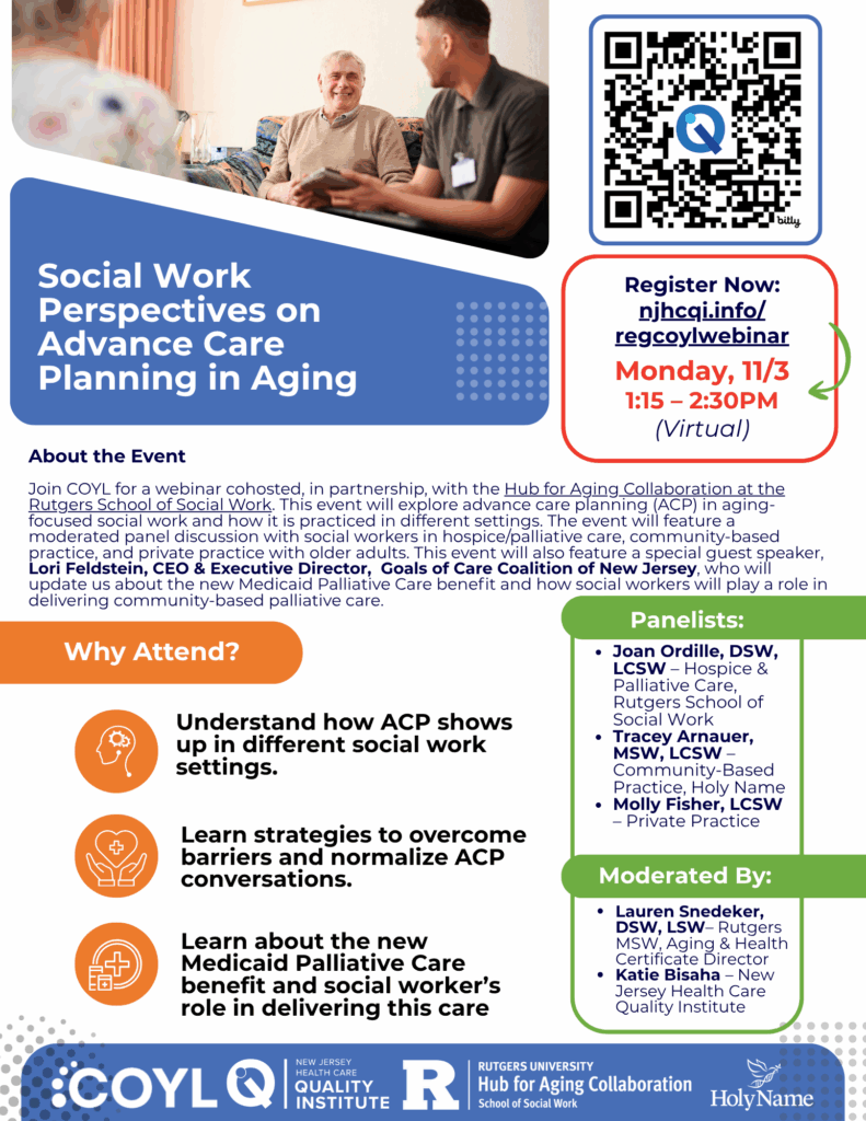 Join COYL for a webinar cohosted, in partnership, with the Hub for Aging Collaboration at the Rutgers School of Social Work. This event will explore advance care planning (ACP) in aging-focused social work and how it is practiced in different settings. The event will feature a moderated panel discussion with social workers in hospice/palliative care, community-based practice, and private practice with older adults. This event will also feature a special guest speaker, Lori Feldstein, CEO & Executive Director, Goals of Care Coalition of New Jersey, who will update us about the new Medicaid Palliative Care benefit and how social workers will play a role in delivering community-based palliative care.